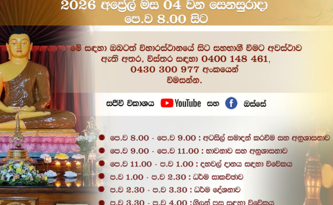 There are monthly and quarterly Sil programs conducting at Sakyamuni Sambuddha Vihara for adults, youths and Dhamma school students.