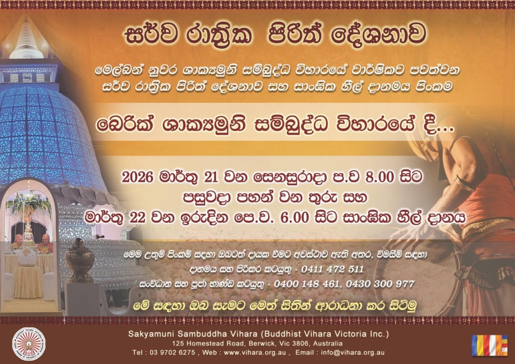 Special “Sadaham Vessa” Sil and meditation program will be held at the Sakyamuni Sambuddha Vihara on 09th December 2023 from 8.00 am to 5.00 pm. You may participate in the Sil program at the Vihara or online using the Vihara online channels listed below.