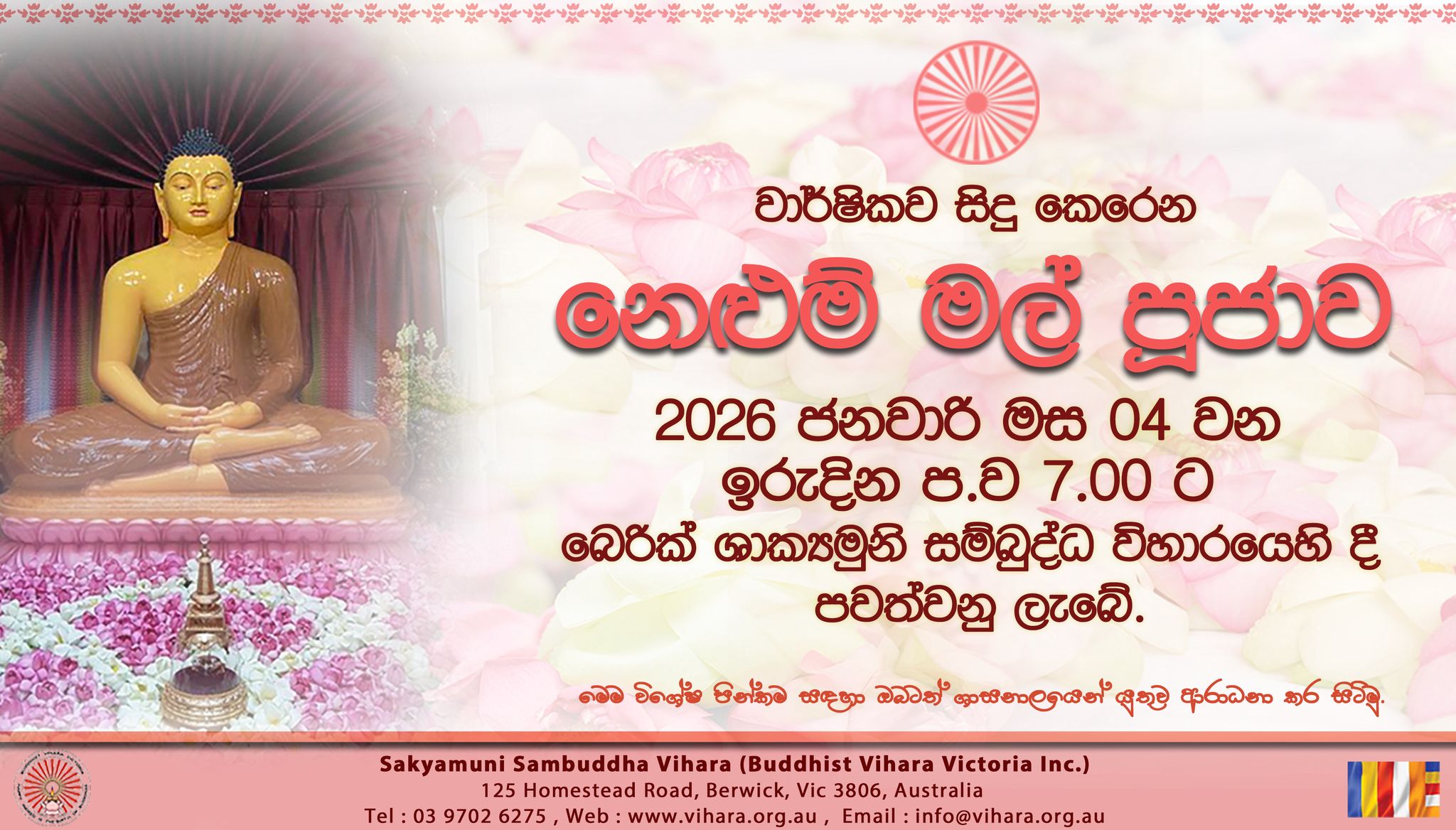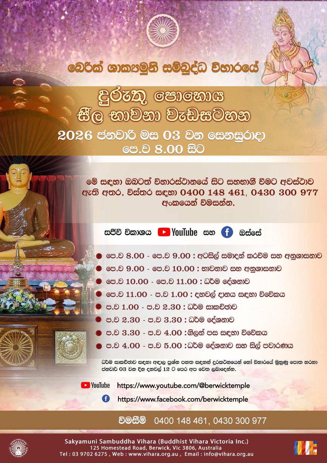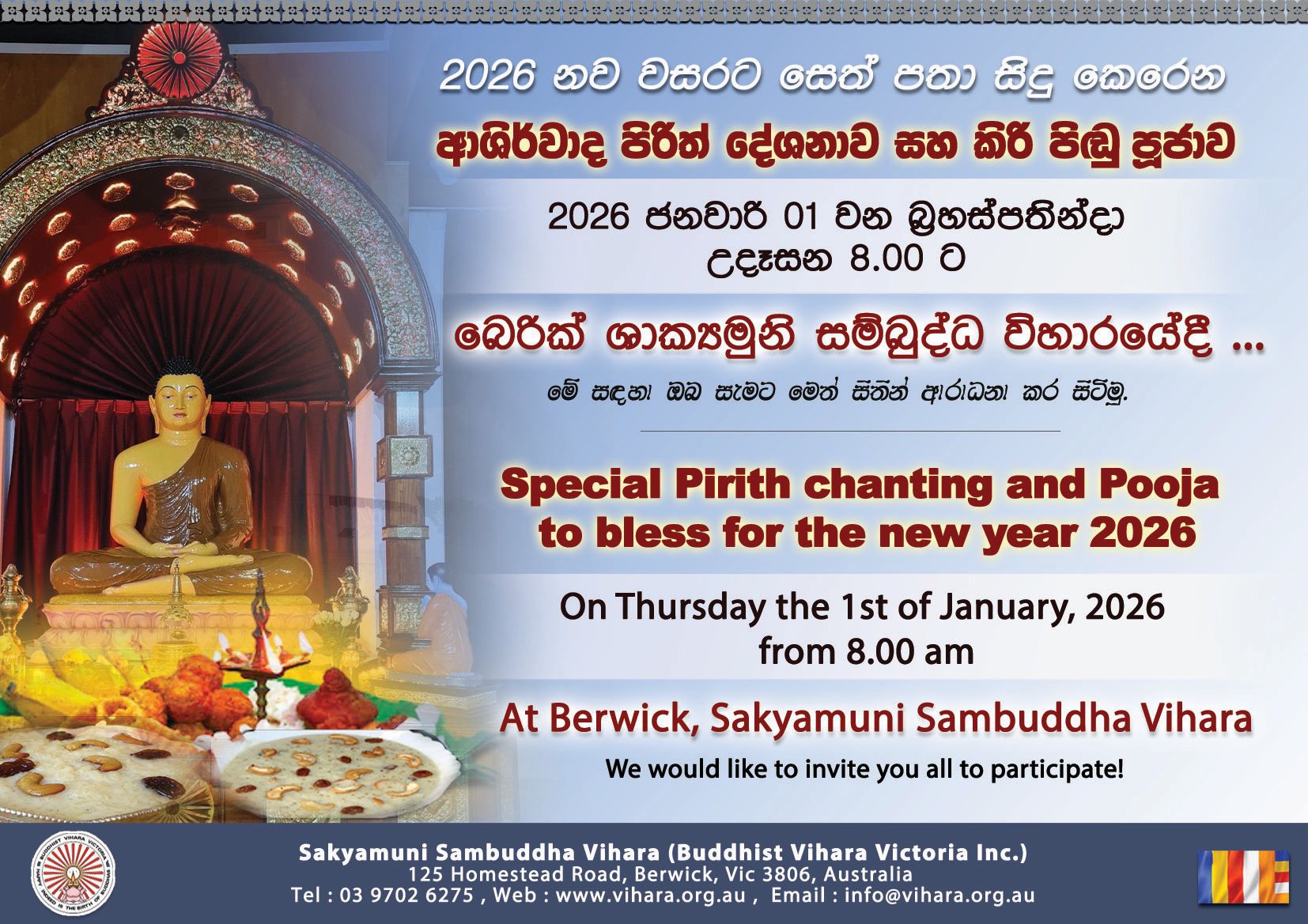 Dear Devotees, On Thursday, the 1st of January 2026, there will be a special Pirith chanting and Kiri Pidu Pooja at Berwick, Sakyamuni Sambuddha Vihara to bless for the new year 2026 from 8.00 am. We would like to invite you all to participate with your family members to receive blessings for the new year.…