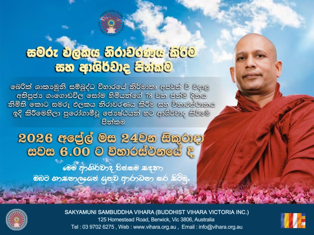 A special almsgiving will be held at the Sakyamuni Sambuddha Vihara on Sunday 13th December 2026 from 10.00 am related to the 23rd commemoration of Ven. Gangodawila Soma Thero. You are kindly invited to participate the almsgiving at the Vihara.