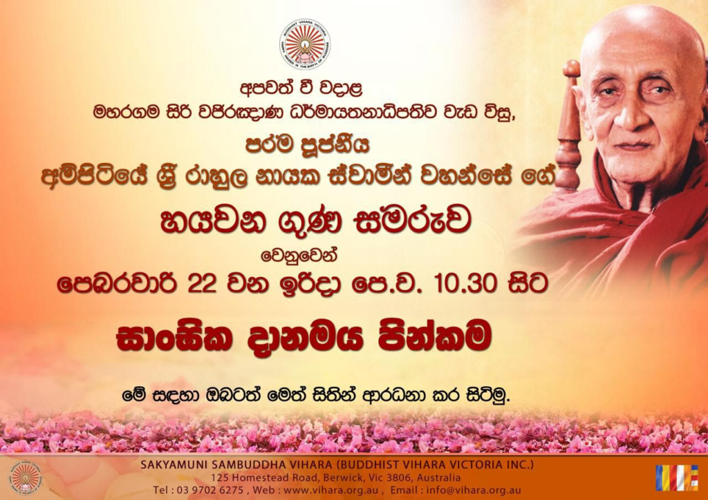 The 23rd commemoration and almsgiving ceremony of Most Venerable Madihe Pannaseeha Maha Nayaka Thero will be held on Sunday, 13th of September 2026 at the Vihara premises. We kindly invite you to participate this meritorious event.