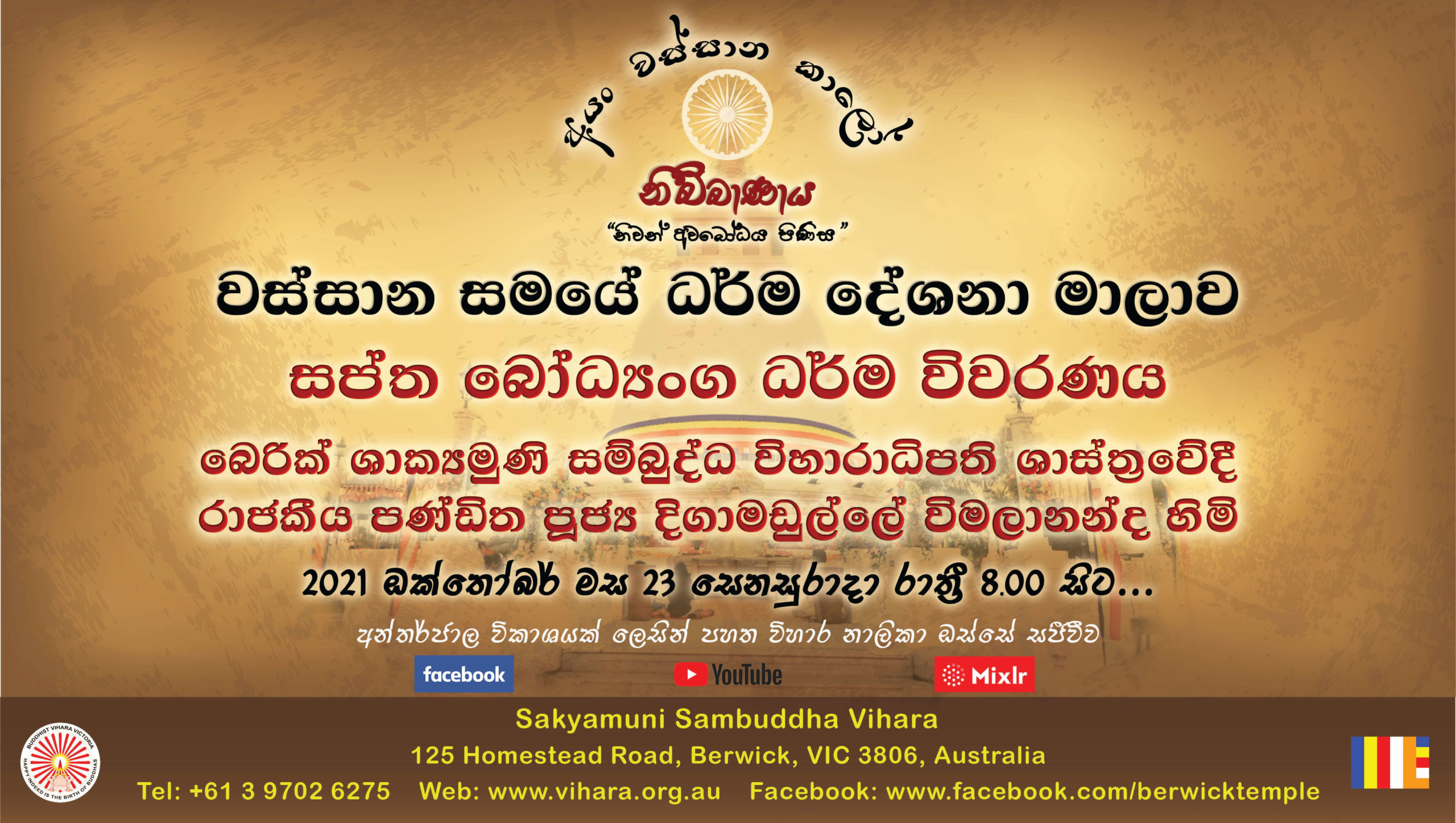 From Saturday, 24th July, a series of Dhamma sermons will be broadcast via Vihara media network as a part of Vassana Season.