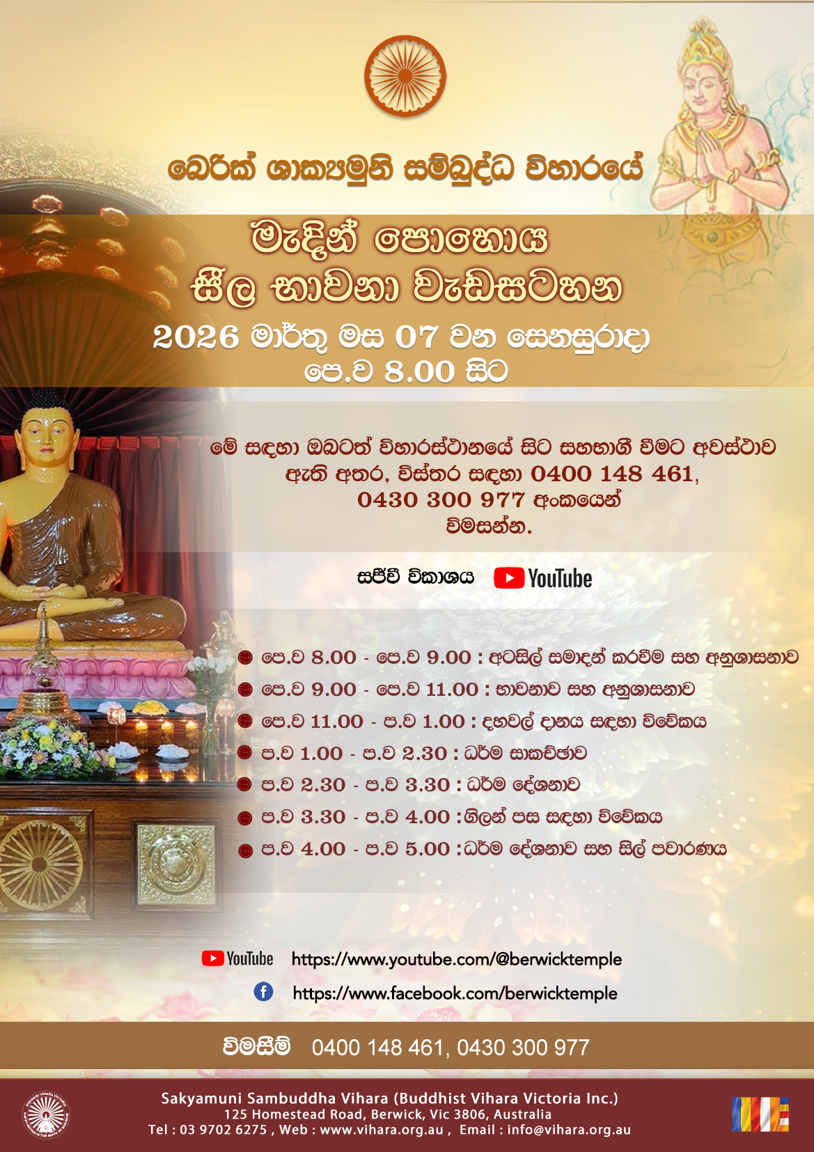 Monthly Sil program will be held on this day from 8.00 AM to 5.00 PM at the Sakyamuni Sambuddha Vihara.