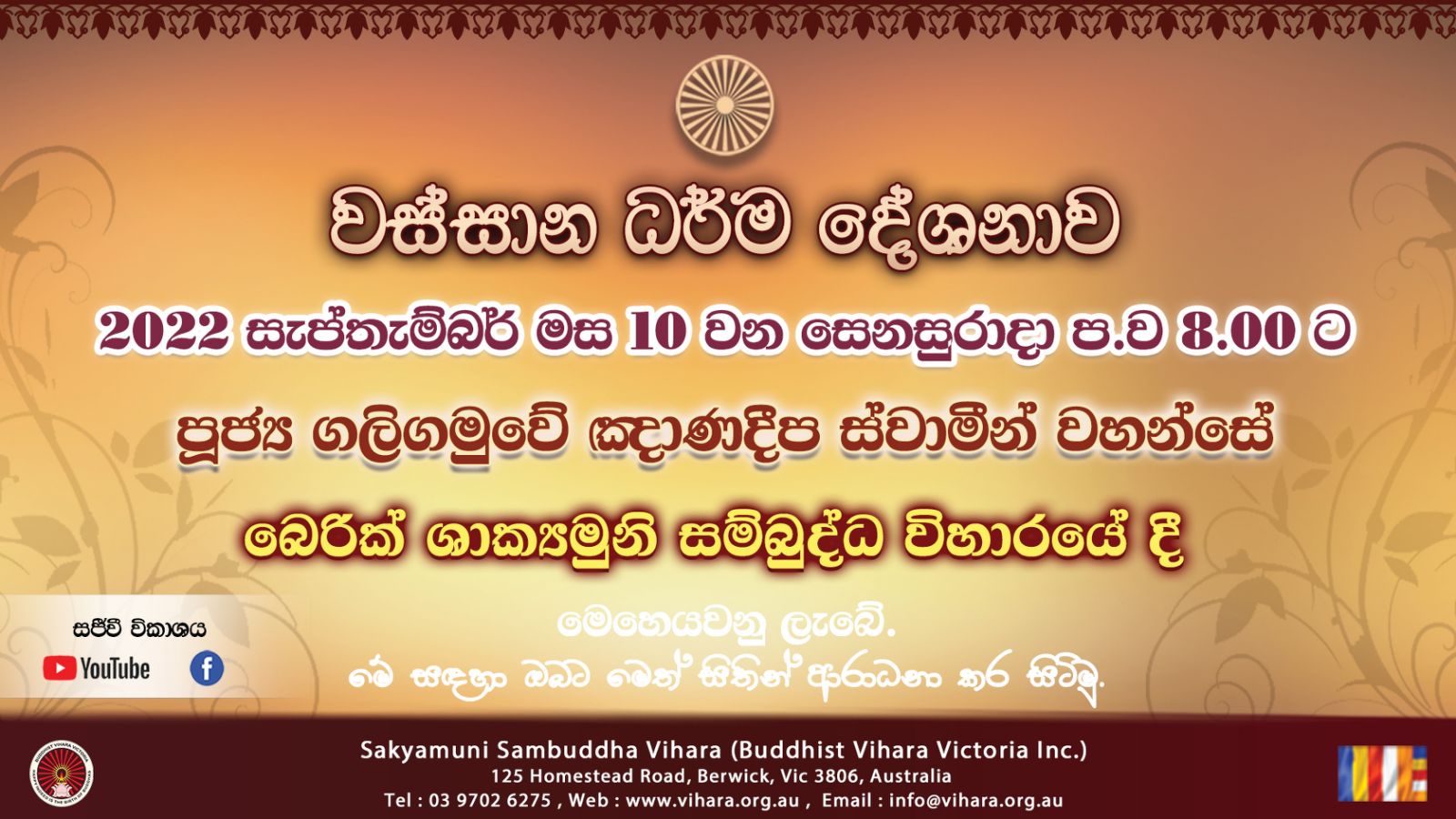 The ninth Vas Dhamma Sermon during this Vas season will be conducted by Venerable Galigamuwe Gnanadeepa Thero on coming Saturday, 10th September 2022 from 8.00 PM. Please refer to the flyer below for more details. Due to the COVID-Safe guidelines for social distancing, only 100 participants can be accommodated inside the building. Others can participate as usual via the online channels listed below.