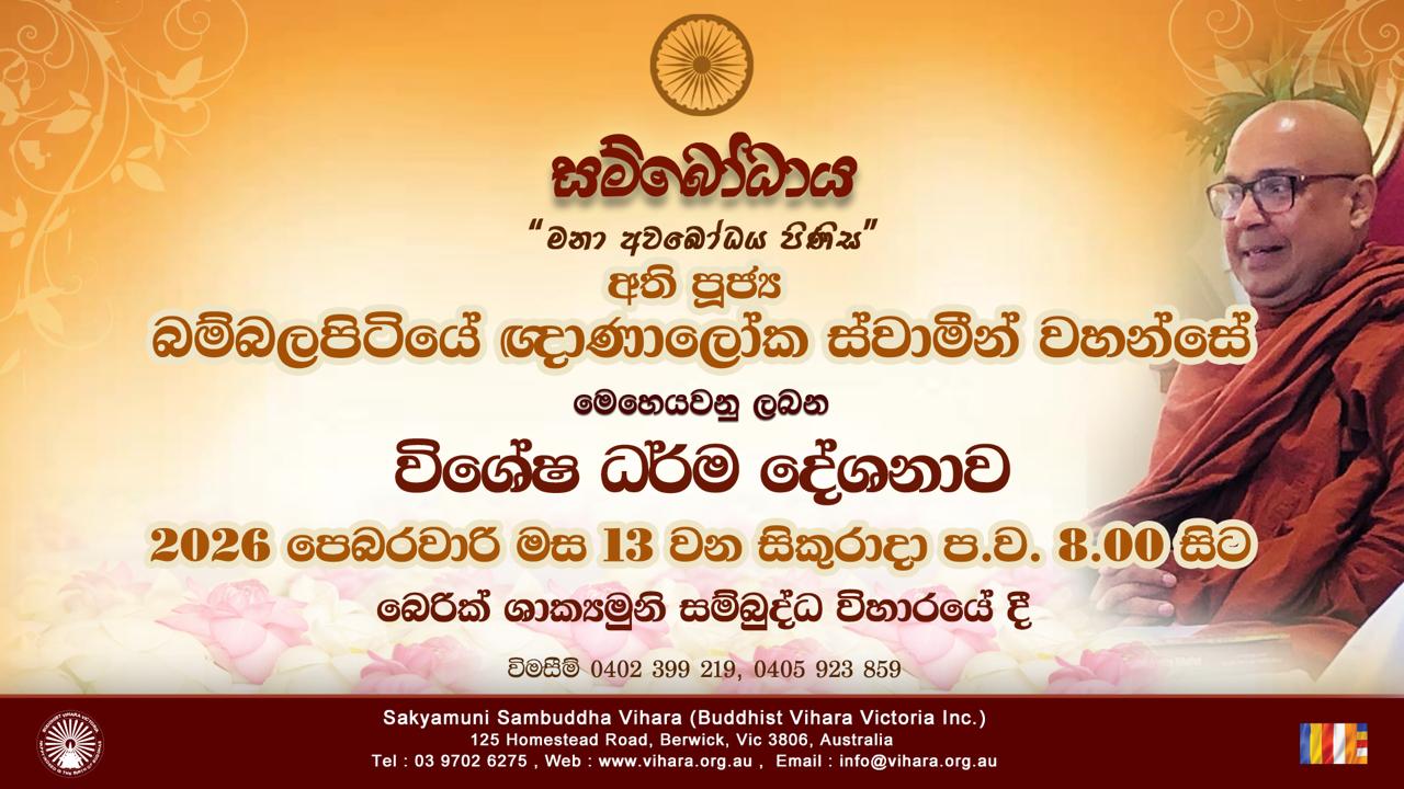 A special Dhamma sermon will be conducted by Ven. Bambalapitiye