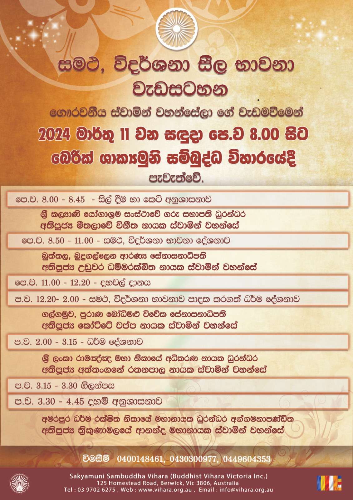 A special Sil and Meditation program (සමථ සහ විදර්ශනා) will be held on Monday, 11th of March 2024 from 8.00 am at the Sakyamuni Sambuddha Vihara. You may participate in the program at the Vihara or online using the Vihara online channels listed at the end of this email.