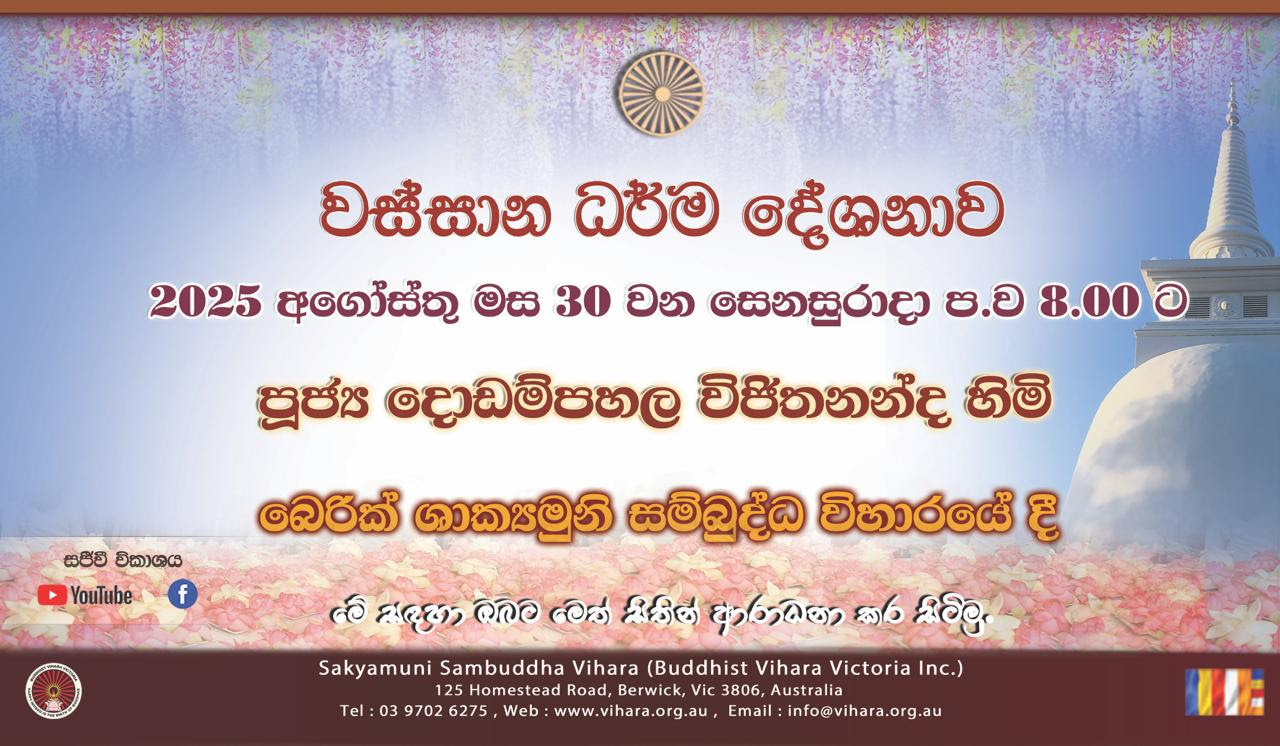 Vas Dhamma Sermons will be conducted on Saturdays from 8.00 pm during the Vas season. This Dhamma Sermon will be conducted by Venerable Dodampahala Vijithananda Thero on Saturday, 30th August from 8.00 PM.