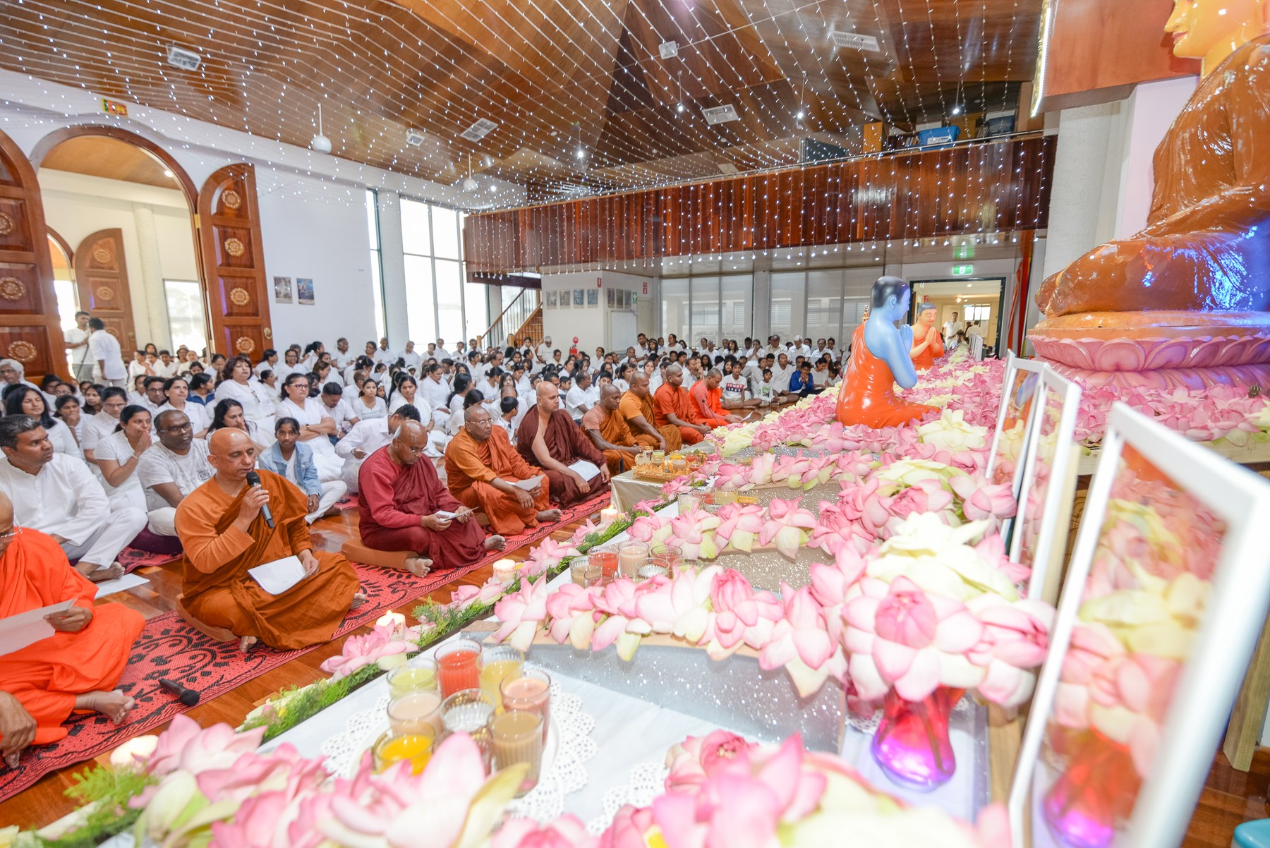 The ceremony consists of chanting of stanzas and chanting of Paritta (protection) and transferring of merits; the residing Monks will guide the devotees and conduct the