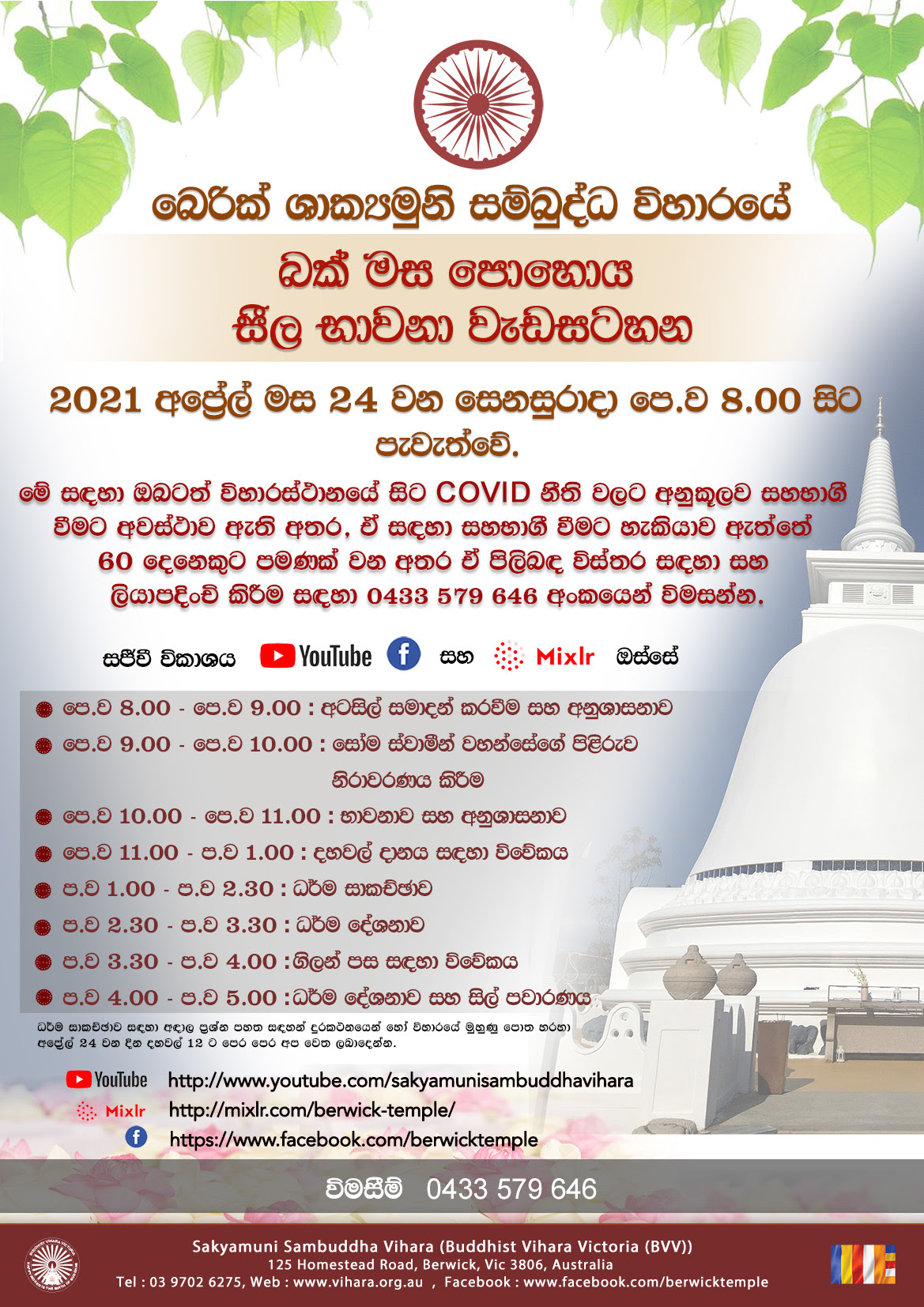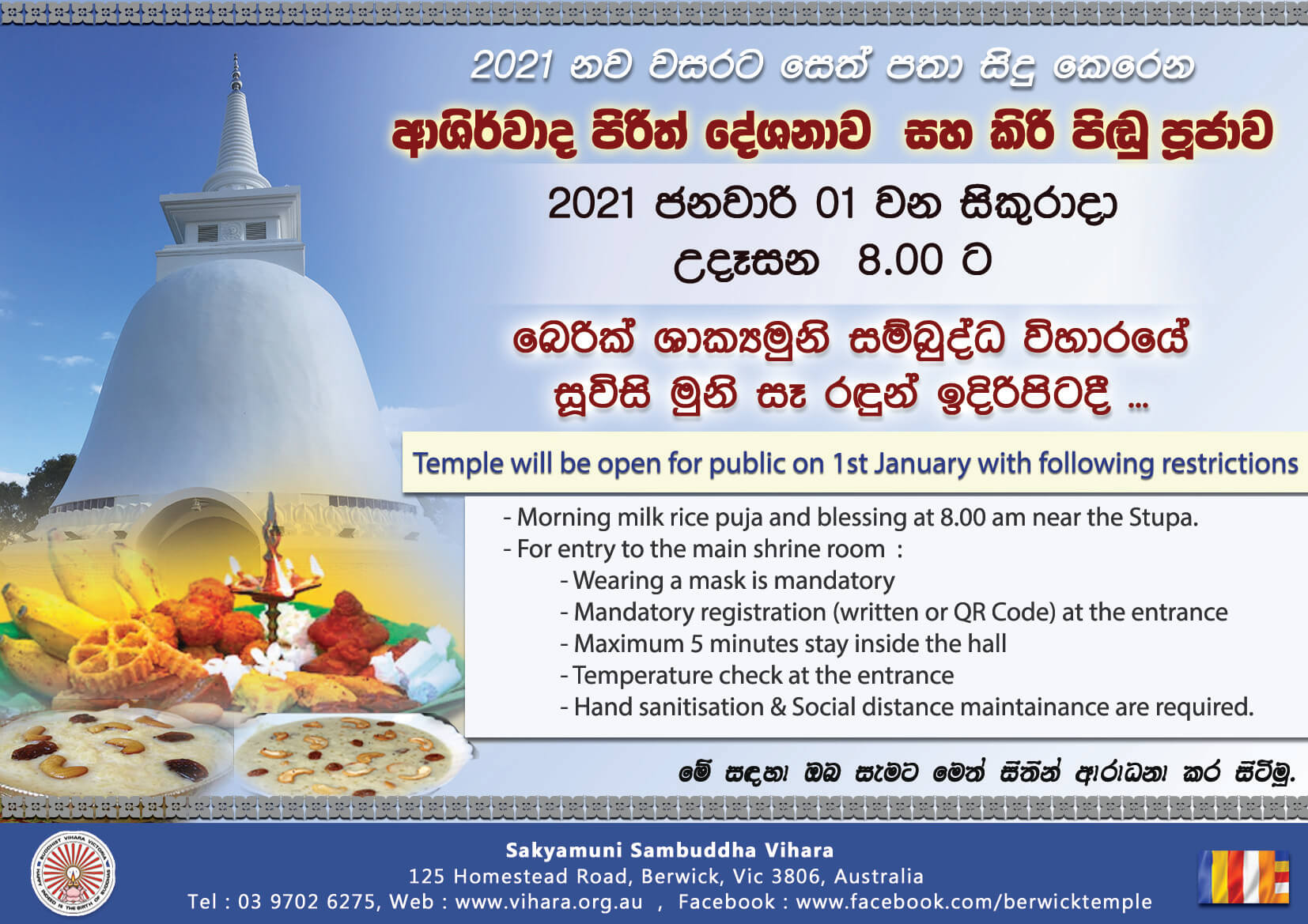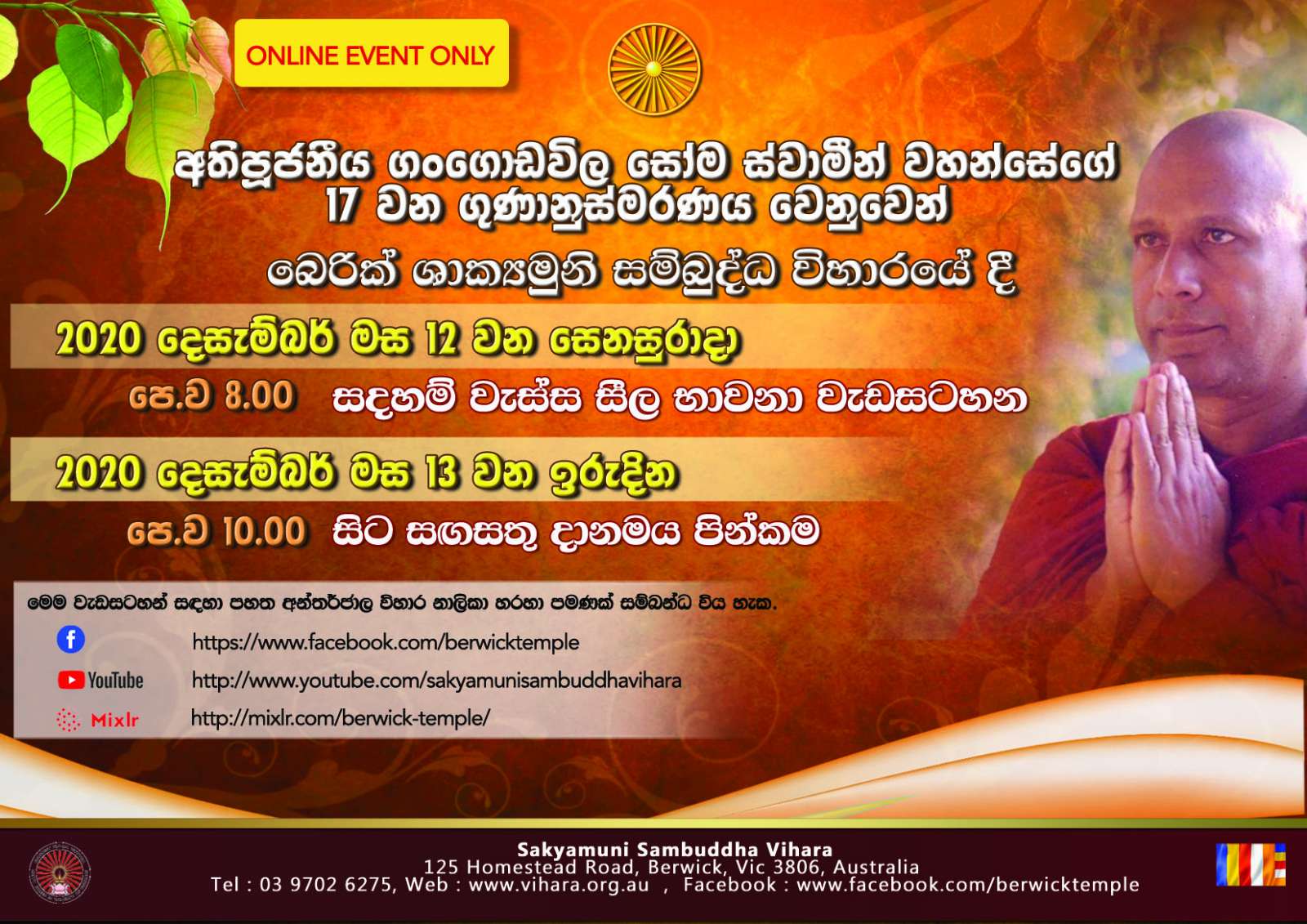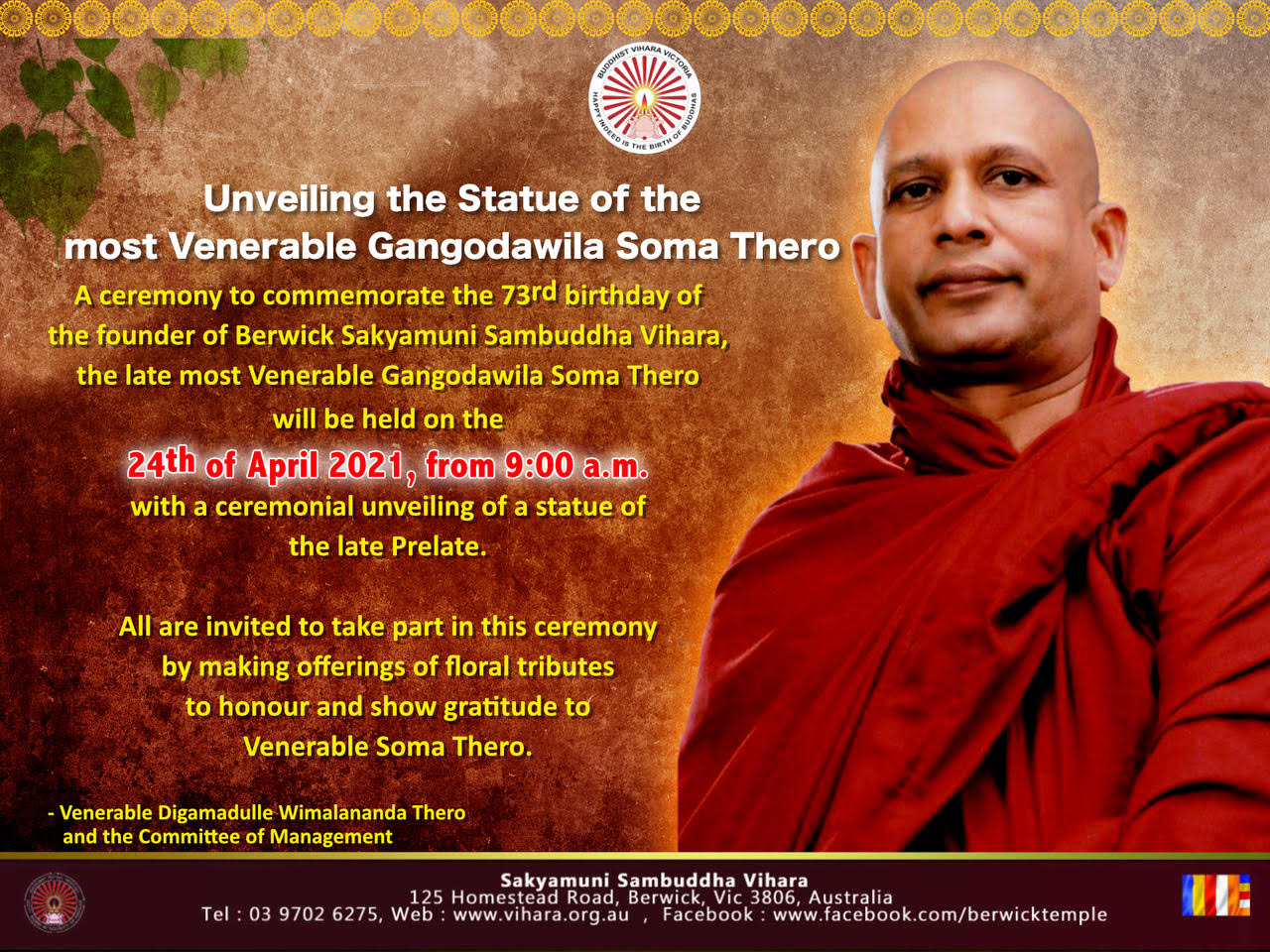 Sakyamuni Sambuddha Vihara 125 Homestead Road, Berwick, Victoriaදැයම පුබුදුවා ලූ, සසුනඹර එලිය කල බුද්ධ පුත්රයාණන් වහන්සේ ... පූජ්ය ගංගොඩවිල සෝම ස්වාමීන් වහන්සේ ගේ පිළිරුව නිරාවරණය කිරීමේ මහා පින්කම, හිමියන් විසින් නිර්මිත, ශාක්යමුනි සම්බුද්ධ විහාර පුද බිමේදී අප්රේල් 24 වන සෙනසුරාදා උදෑසන 9.00 සිට පැවැත්වේ. කෘතවේදිත්වය පුෂ්පෝපහාරයක් ලෙසින් පුද දෙන්න, ඔබටත් මෙත් සිතින් ආරාධනා කර සිටිමු. මේ එම වැඩසටහන සම්බන්ධ විශේෂ සාකච්ඡාවකි... An…