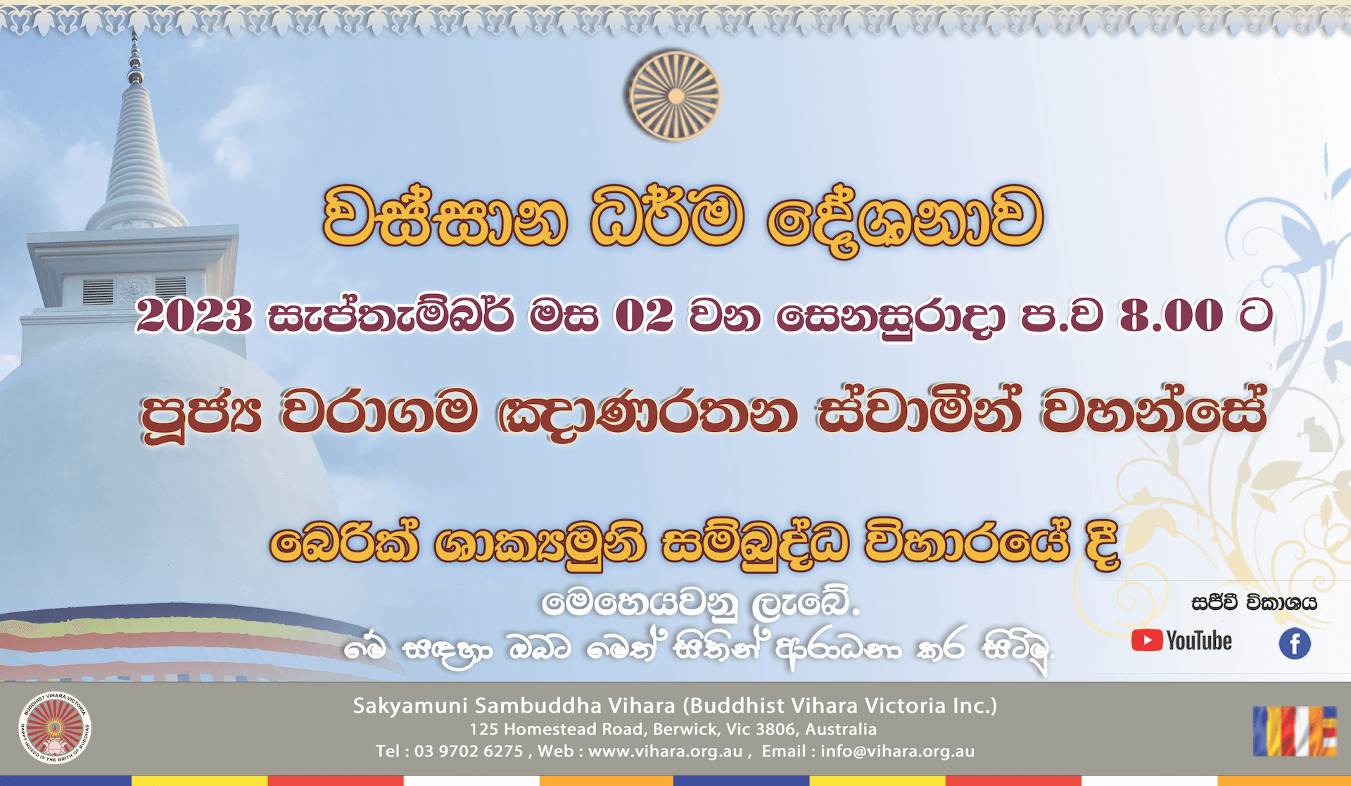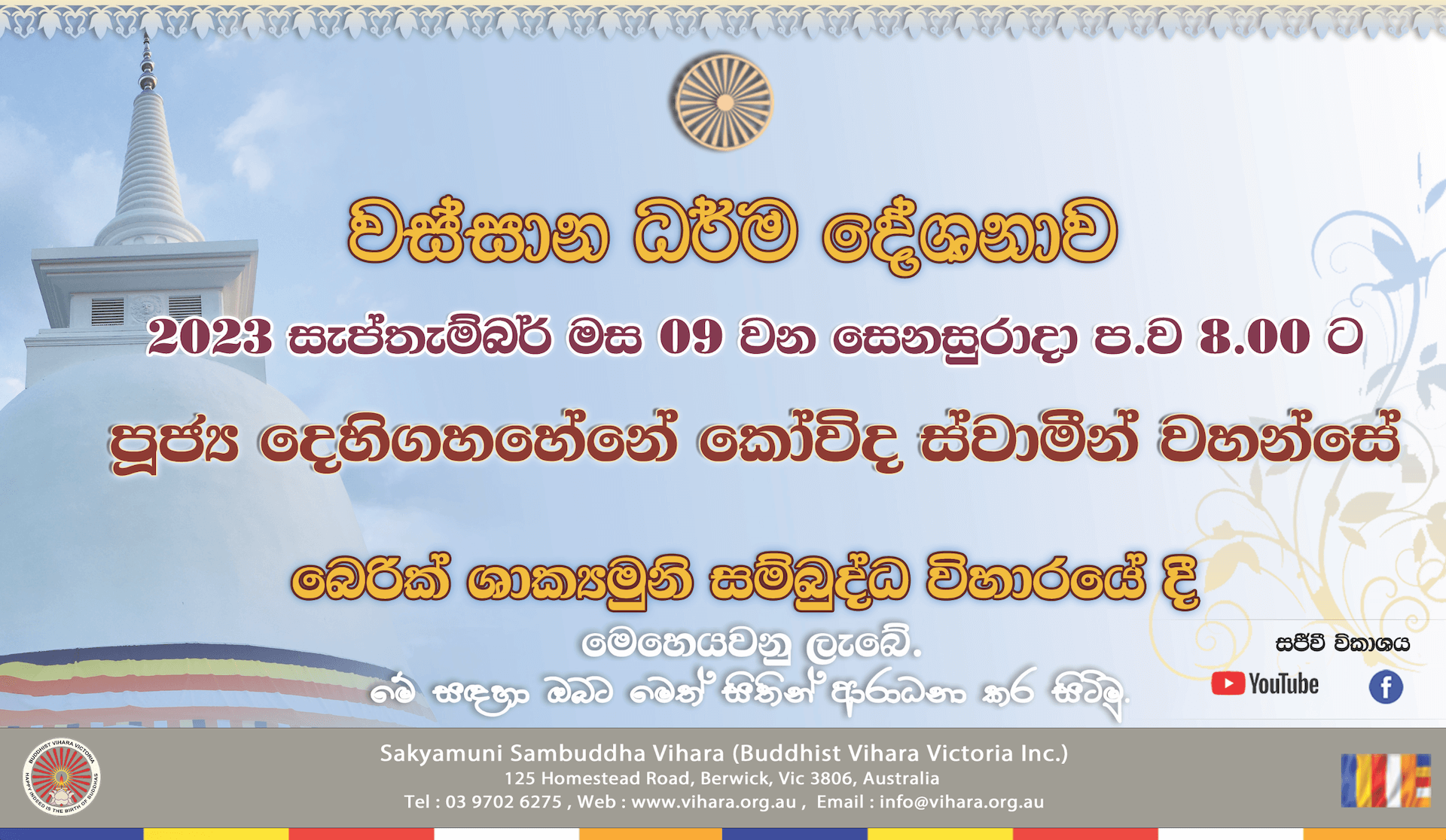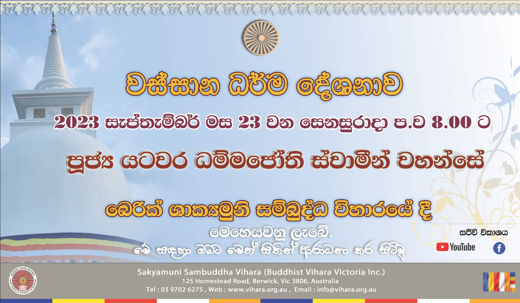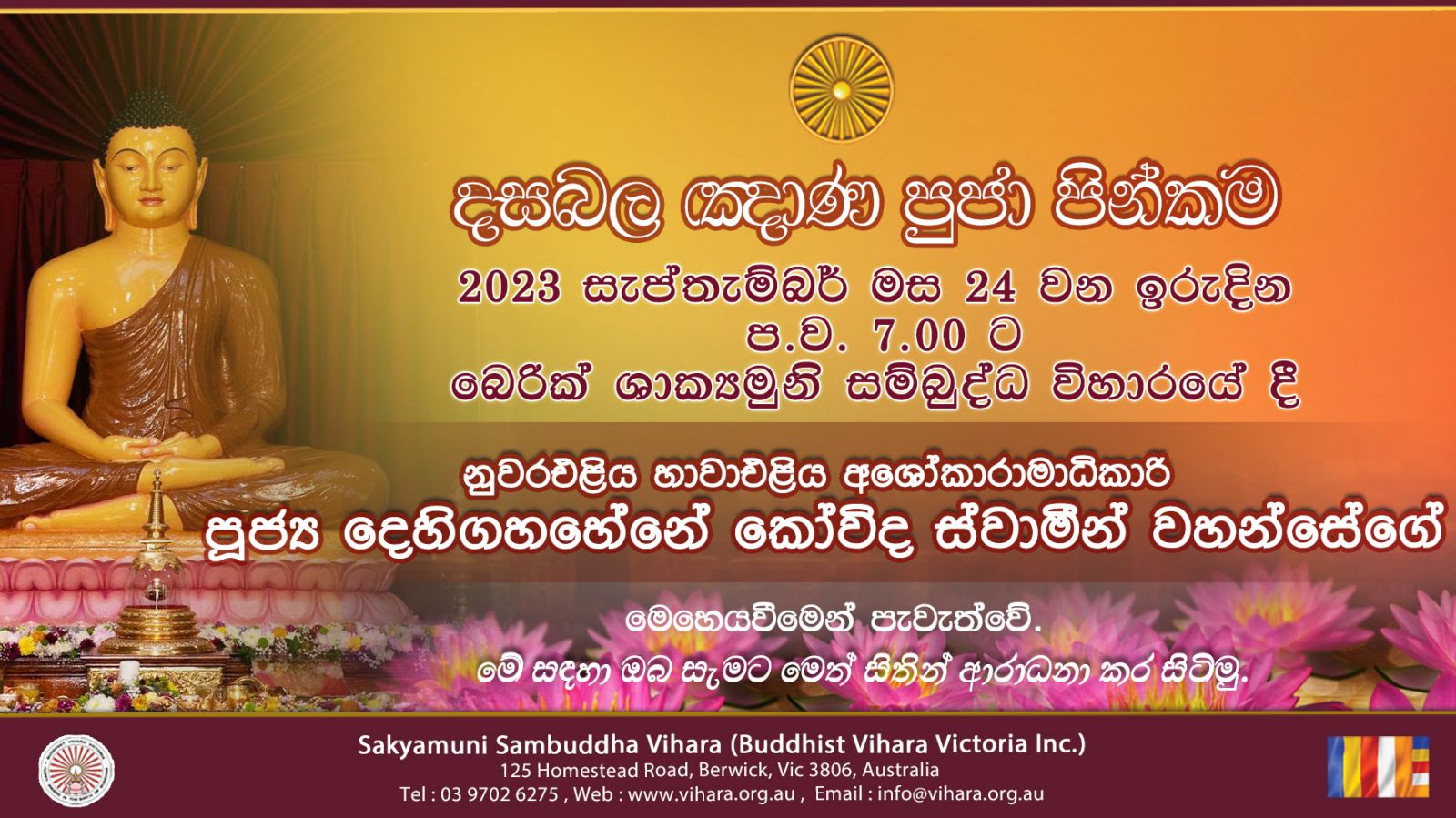 Sakyamuni Sambuddha Vihara 125 Homestead Road, Berwick, VictoriaDear Devotees, A Special Dasabala Gnana Pooja will be conducted on Sunday, 24th September from 7.00 PM, We kindly invite you for this rare meritorious event. Please see below notice for details. May the Noble Triple Gem bless you!