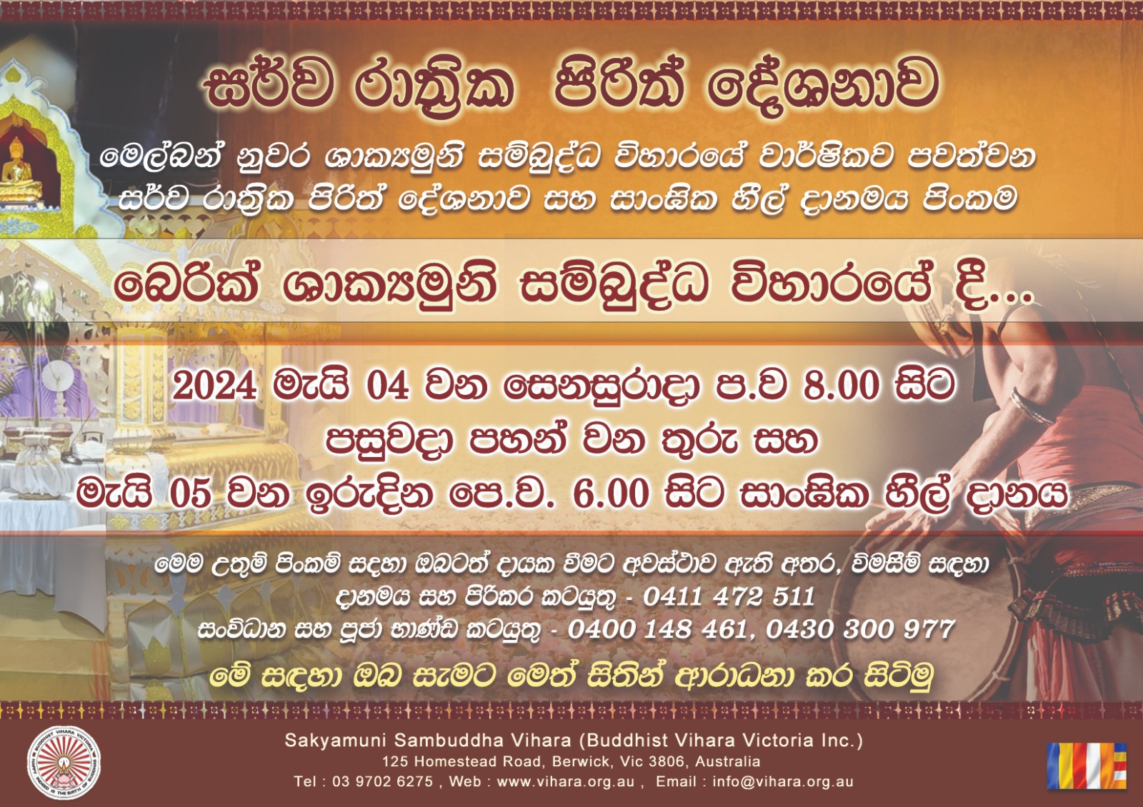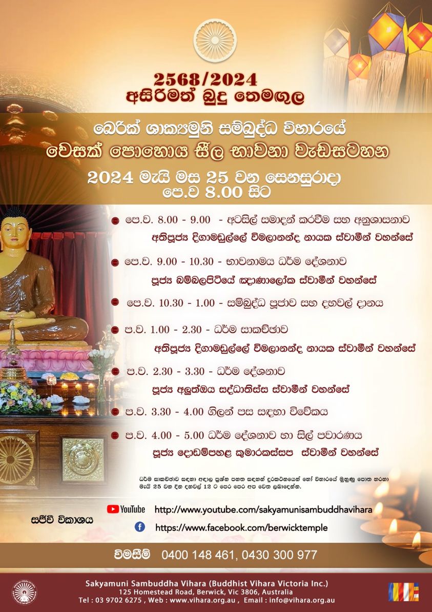 Sakyamuni Sambuddha Vihara 125 Homestead Road, Berwick, VictoriaDear Devotees, The Poson Sil program will be held on Saturday 22nd of June 2024 from 8.00 am to 5.00 pm at the Sakyamuni Sambuddha Vihara. Please contact via 0400 148 461, 0430 300 977 for any enquiries. Please see the flyer for program details. අන්තර්ජාල සජීවීනාලිකා / Live streaming channels YouTube link: https://www.youtube.com/@berwicktemple Facebook link: https://www.facebook.com/berwicktemple/…