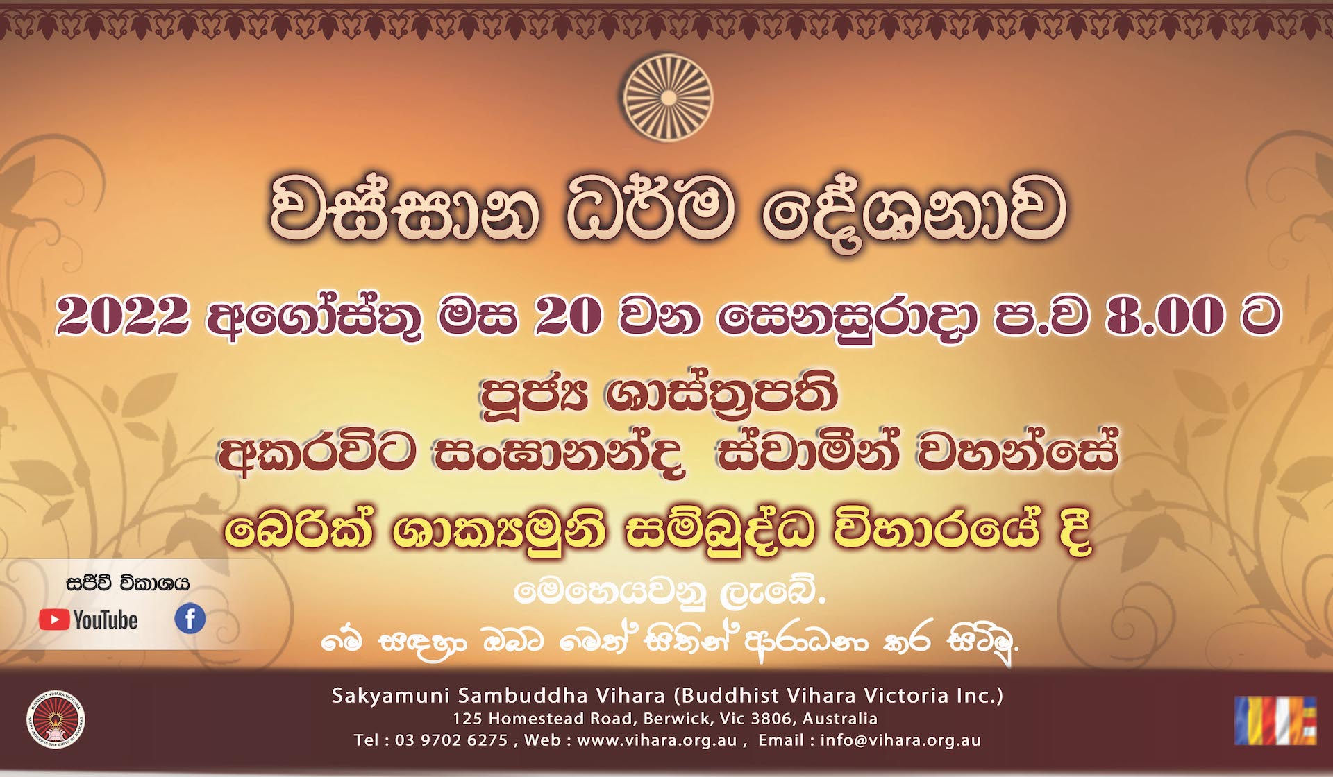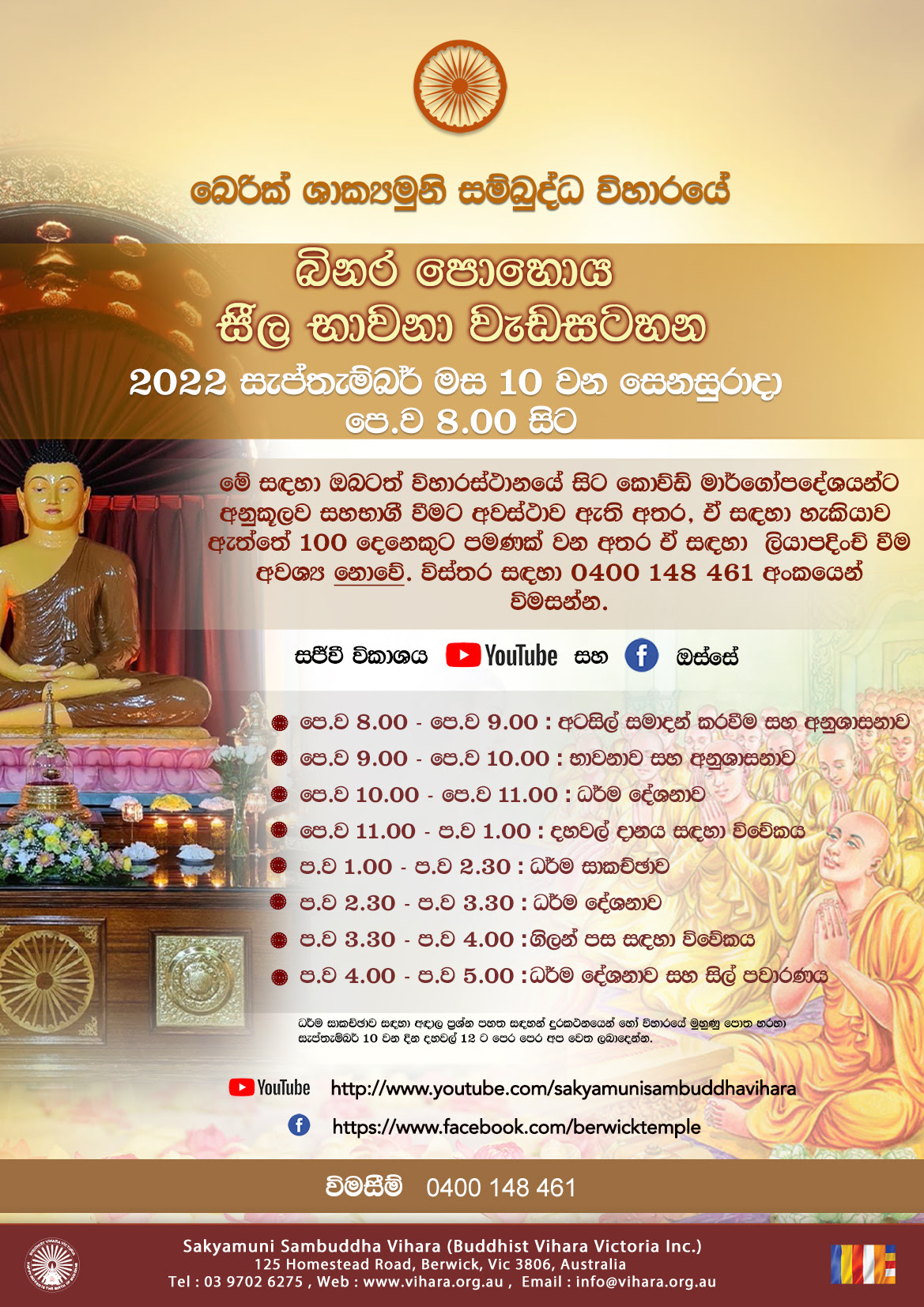 Sakyamuni Sambuddha Vihara 125 Homestead Road, Berwick, VictoriaDear Devotees, The guided meditation program will be running every Saturday (with some exceptions, please check the website event calendar before attending) from 5.00 pm to 6.45 pm and please arrive by 4.45 pm to start on time and minimise any disturbances to the other participants after starting the program. Also, you are welcome to…